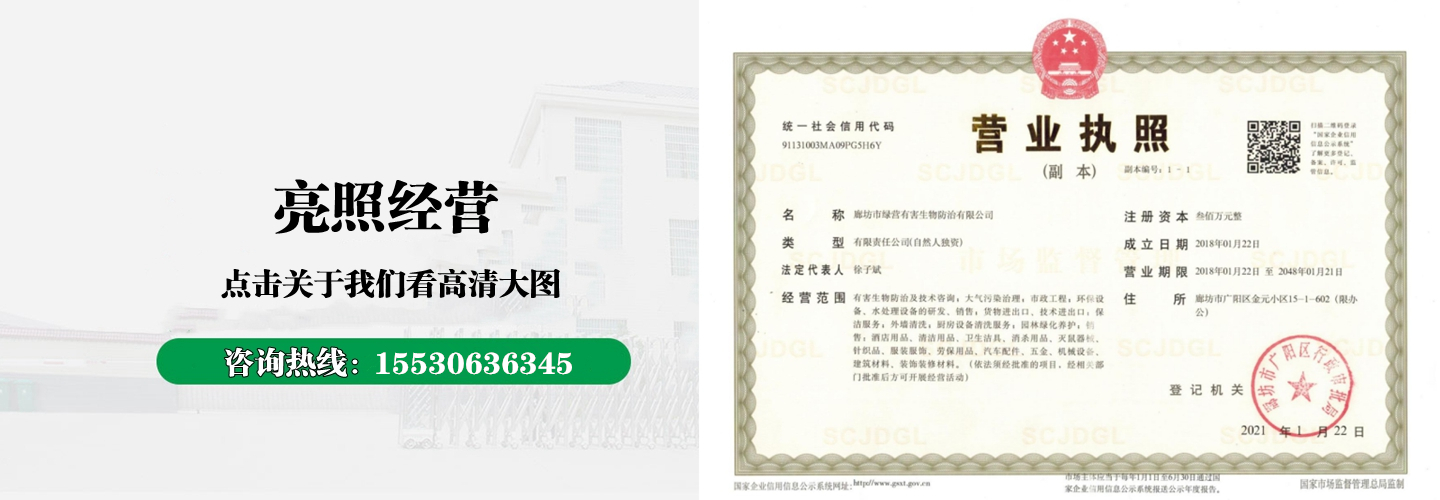廊坊市綠營(yíng)有害生物防治有限公司從事新建、改建、擴(kuò)建房屋的白蟻預(yù)防和滅治工程及家居有害生物綜合治理工程(包括滅白蟻、滅老鼠、滅蟑螂、滅蚊蠅、滅螞蟻、滅跳蚤、滅蛀蟲、滅臭蟲、殺螨蟲、殺蜈蚣、殺蜘蛛、殺潮蟲、殺野蜂,殺衣魚、殺千足蟲、驅(qū)蛇防蛇等);針對(duì)室內(nèi)外的白蟻及各種害蟲防治具有多年的實(shí)踐經(jīng)驗(yàn)...